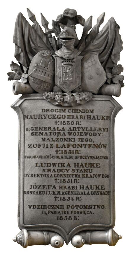 rodzinna płyta epitafijna z kościoła o.o. Kapucynów pw. Przemienienia Pańskiego w Warszawie, gdzie uwidoczniony Józef Hauke, oraz zbliżenie wizerunku herbu hrabiowskiego Hauke-Bosak ze zwieńczenia tej płyty.