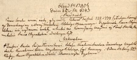 ...ażeby gdy wedle uchwał ... członkom Kommissji Demarkacyjnej ... dyplomata prawa obywatelskiego już wydanemi zostały ... onemu także prawo obywatelstwa udzielonym było... (z uchwały Senatu Rządzącego - ANK., sygn.WMK IV-6, s.283) |