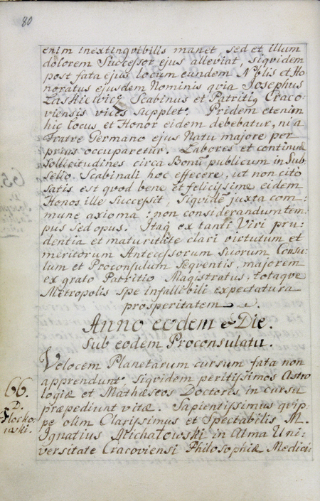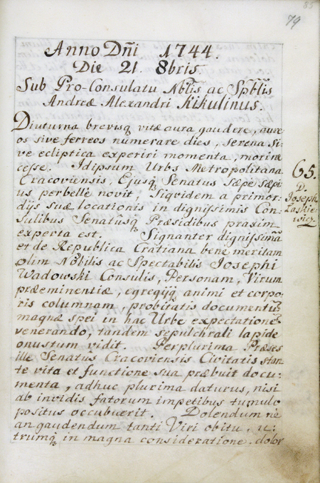 Z urzędowego spisu rajców obejmującego lata 1363–1802 strony 79–80 z wpisem z 1744 roku o wyborze do rady miejskiej po śmierci Józefa Wadowskiego (nr 598) nowego rajcy Józefa Laskiewicza, którego, jak zapisano, „zarówno ze względu na tradycje rodzinne, jak i też ze względu na wyjątkowe dary i uzdolnienia wybrano na ten urząd, pokładając nadzieję, że tak jak poprzednicy będzie on dobrze służył dobru publicznemu” – oraz powiększenie zapisu imienia (Archiwum Państwowe w Krakowie, sygn. rkps 1477, s. 79–80)