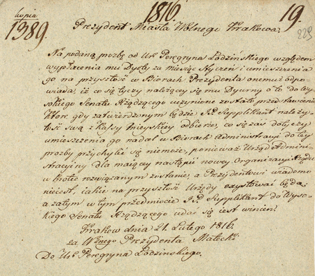 Z akt magistratu miasta Krakowa 1796–1816 fragment strony 229 z odpowiedzią udzieloną 21 lutego 1816 roku przez p.o. prezydenta Józefa Mateckiego na podanie w sprawie wypłaty należnych diet oraz przyszłego zatrudnienia w magistracie; obie sprawy odesłano do organizującego się Senatu Rządzącego – oraz powiększenie nazwiska i urzędu (Archiwum Państwowe w Krakowie, sygn. Mag. I 176, s 229)