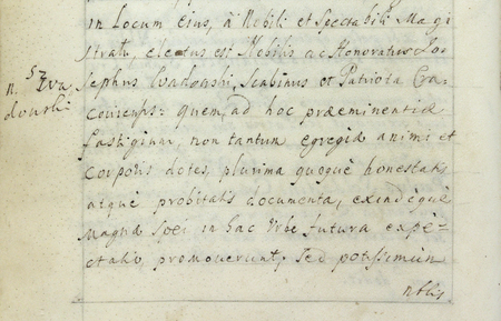 Z urzędowego spisu rajców obejmującego lata 1363–1802 fragment strony 58 z wpisem z 1723 roku o wyborze do rady na miejsce po zmarłym Flawiuszu Marchettim (nr 564) nowego rajcy Józefa Wadowskiego, jak zapisano, „patrioty Krakowa” – oraz powiększenie zapisu imienia i funkcji burmistrza (Archiwum Państwowe w Krakowie, sygn. rkps 1477, s. 58)