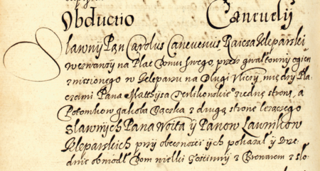 Z księgi ławniczej Kleparza obejmującej lata 1605–1615: początkowy fragment wpisu z 1615 roku dokumentującego wizję lokalną domu Karola Kanesiusa, rajcy kleparskiego, po wielkim pożarze w Kleparzu w tymże roku – oraz zbliżenie zapisu imienia i urzędu (Archiwum Narodowe w Krakowie, sygn. KL 6, s. 837v)