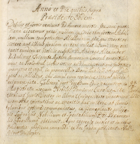 Z urzędowego spisu rajców obejmującego lata 1363–1802 fragment strony 111 z wpisem z 1774 roku o wyborze do rady miejskiej po śmierci Andrzeja Aleksandra Kikulinusa (nr 606) nowego rajcy Karola Likego, jak zapisano: „wielce zasłużonego swą wiedzą i pracą dla miasta” – oraz powiększenie zapisu imienia (Archiwum Państwowe w Krakowie, sygn. rkps 1477, s. 111)