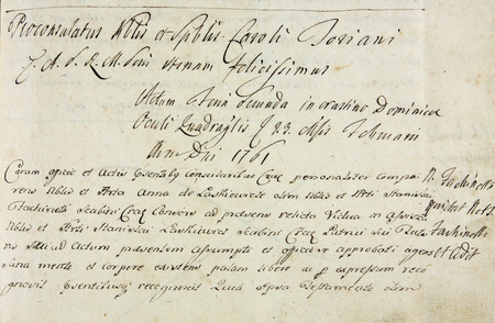Z księgi radzieckiej obejmującej lata 1757–1763 fragment strony 751 z wpisem tytułu otwierającego zapisy spraw za kadencji burmistrzowskiej Karola Toryaniego w 1761 roku – oraz powiększenie zapisu imienia i funkcji burmistrza (Archiwum Państwowe w Krakowie, sygn. rkps 482, s. 751)