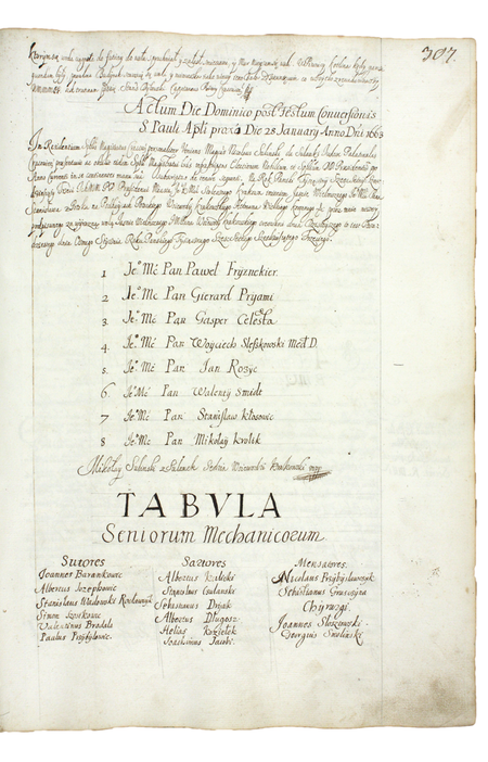 Z księgi radzieckiej obejmującej lata 1661–1664 strona 307 z wykazem rajców urzędujących nominowanych na rok 1663, wśród których znajduje się Kasper Celesta – oraz powiększenie zapisu imienia (Archiwum Państwowe w Krakowie, sygn. rkps 465, s. 307)