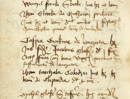 Z księgi przyjęć do prawa miejskiego w Krakowie obejmującej lata 1423–1493 fragment strony 286 z wpisem z 1477 roku stwierdzającym przyjęcie do prawa miejskiego Kaspra Gengnera z Łańcuta – oraz powiększenie zapisu imienia i miejsca pochodzenia (Archiwum Państwowe w Krakowie, sygn. rkps 1421, s. 286)