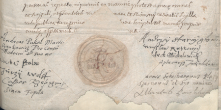 Z urywków i wyciągów z akt ławniczych (scabinalia) miast polskich, w tym Kazimierza przy Krakowie: końcowy fragment kopii dokumentu z 1613 roku z podpisami rajców, wśród nich Kaspra Rzepczyńskiego; kopię tę wystawiał urząd ławniczy, stąd pieczęć ławnicza kazimierska odciśnięta na dokumencie w wosku przez papier – oraz zbliżenie zapisu imienia (Biblioteka Naukowa PAU/PAN, sygn. rkps 440, k. 46)