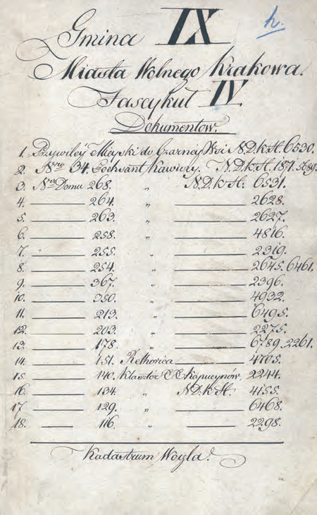 Z Księgi gruntowej Krakowa – vol. antiqua Gmina IX strony ze sporządzonego w 1821 r. i podpisanego przez wójta Kazimierza Zakrzowskiego wykazu statystycznego realności znajdujących się w Gminie IX Miejskiej, mającego służyć ułożeniu katastru hipotecznego (Archiwum Narodowe w Krakowie, sygn. rkps dok. dep. 232, nlb)