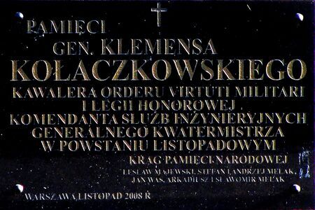 Klemens Kołaczkowski, herbu Habdank, generał wojsk Królestwa Polskiego, inżynier wojskowy. Urodzony w październiku 1793 r. w Poznaniu, syn Ignacego i Józefy z Grudzińskich. Absolwent Szkoły Aplikacyjnej Artylerii i Inżynierów w Warszawie. W latach 1810–1811 w randze porucznika nadzorował prace fortyfikacyjne w Modlinie i Zamościu, w kampanii napoleońskiej 1812 r. walczył m.in. pod Borodino i nad Berezyną. W 1815 r. wstąpił do wojska Królestwa Polskiego. W latach 1816–1818 w randze kapitana był szefem robót przy demarkacji granicy z Wolnym Miastem Krakowem, zaś do wybuchu powstania listopadowego dyrektorem naukowym w Szkole Aplikacyjnej; w powstaniu objął dowództwo korpusu inżynierów, następnie jako generał brygady został kwatermistrzem generalnym. Brał udział w obronie Woli oraz Modlina. Po upadku powstania listopadowego osiadł w Żernikach k. Kruszwicy, w latach 60. XIX w. przeniósł się do Drezna. Odznaczony m.in. orderami św. Włodzimierza IV kl. i św. Anny z brylantami II kl., w 1813 r. francuskim tytułem kawalera Orderu Legii Honorowej i polskim Krzyżem Złoty Orderu Virtuti Militari. Żonaty z Michaliną Kościelską, miał dwie córki: Józefę i Marię. Zmarł 23 września 1873 r. w Dreźnie; pochowany na tamtejszym Starym Cmentarzu Katolickim.