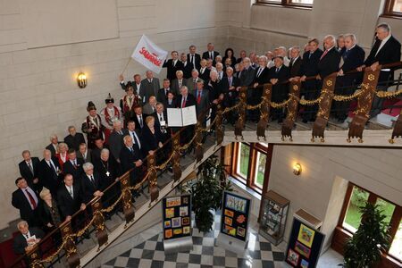 Widok Sali Obrad RMK po wręczeniu medalu i dyplomu, na pierwszym planie przy dyplomie od lewej strony: Władysław Kielian, Wojciech Grzeszek, Mieczysław Gil i Maciej Mach; zdjęcie grupowe uczestników uroczystości na schodach wiodących z holu Kamiennego do Sali Obrad Pałacu Wielopolskich.