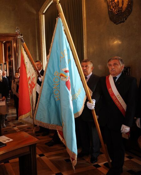Z uroczystości wręczenia medalu z dyplomem 18 września 2013 r. w Pałacu Wielopolskich. Poczty sztandarowe oraz logo laureatki.