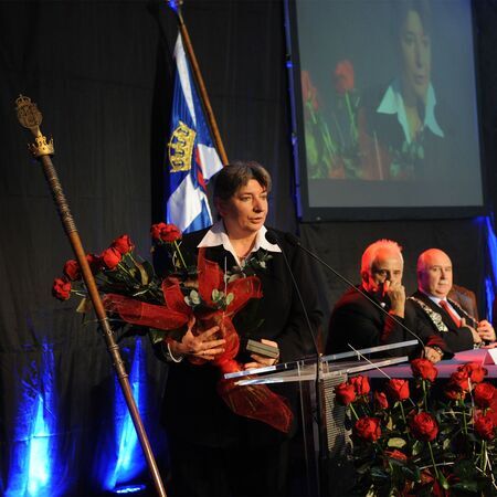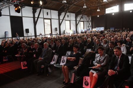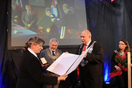Z uroczystości wręczenia medalu z dyplomem 13 października 2011 r. w Muzeum Inżynierii Miejskiej w Krakowie, w historycznej zajezdni tramwajowej. Wystąpienie dyrektor Krakowskiego Pogotowia Ratunkowego dr Małgorzaty Popławskiej oraz logo laureata.