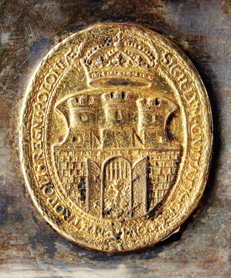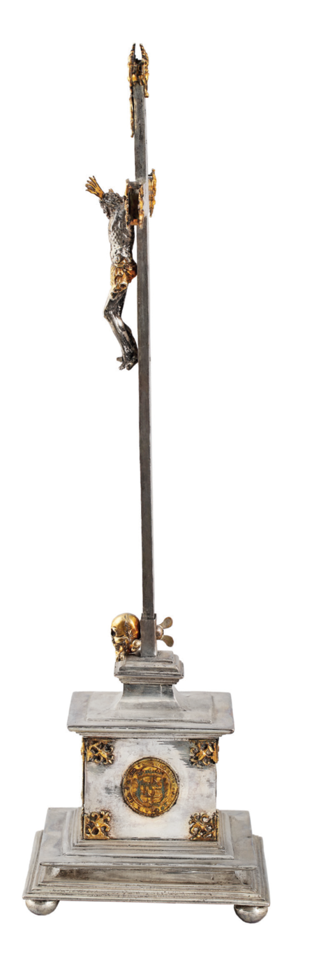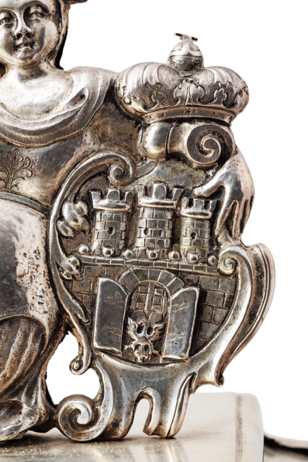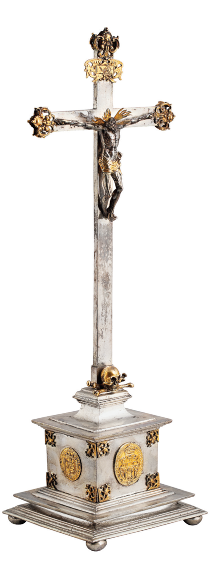 (370–372) Przekazany w 1679 r. dar rajcy Michała Stanisława Segnitza dla krakowskiej rady miejskiej (zob. il. 369) – krucyfiks z postacią Chrystusa na cokole (srebro, wymiary: wysokość 55 cm, podstawa 16 x 16 cm). Na przedniej ścianie cokołu wytłaczana, złocona plakieta z herbem Krakowa według wzoru wprowadzonego uchwałą z 1661 r. Cała plakieta jest wzorowana na pieczęci miasta sporządzonej na podstawie tej uchwały – zob. il. 067–069 (zbieżny rysunek herbu, taka sama treść napisu w otoku: SIGILLVM CIVITATIS CRACOVIAE METROPOLIS REGNI POLONIAE [pieczęć miasta Krakowa stolicy Królestwa Polskiego]). Na bocznych ściankach cokołu widnieje herb rodziny Segnitzów. Krucyfiks służył w uroczystych okolicznościach, w tym przy zaprzysięganiu rajców; spotkamy go też w latach 30. XX w. przy zaprzysięganiu prezydentów miasta – zob. il. 379–381 (MK, nr inw. MHK 856/II)