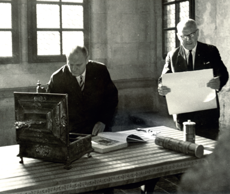 (382) Podczas otwarcia Wieży Ratuszowej 3 listopada 1967 r. w sali Wykuszowej prezes Rady Związku Izb Rzemieślniczych, poseł Józef Raźny odczytuje dokument dotyczący zegara wieżowego i jego mechanizmu. Przy eksponowanej na tę okoliczność historycznej ladzie radzieckiej widać autora zabezpieczenia konstrukcji wieży dr. Władysława Borusiewicza, profesora i rektora Politechniki Krakowskiej (MK, nr inw. MHK Fs 21020/IX/3)
