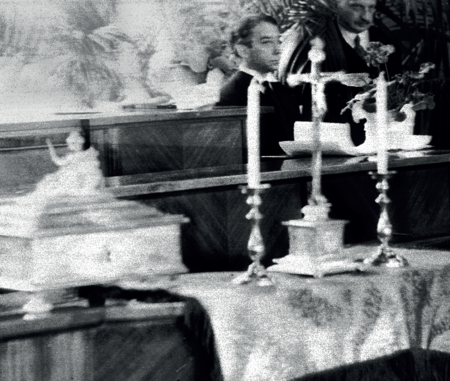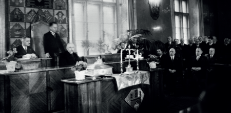 (379–380) Zaprzysiężenie prezydenta Mieczysława Kaplickiego w lutym 1933 r. Z przodu podium prezydialnego w sali Obrad w Pałacu Wielopolskich ekspozycja staropolskich insygniów radzieckich: lady i krucyfiksu. Na fotografii widoczni: przemawiający prezydent Mieczysław Kaplicki, z jego prawej strony sekretarz Prezydium Rady Miejskiej Tadeusz Piotrowski, w pierwszym rzędzie wiceprezydent Ignacy Landau. Na powiększeniu fragmentu fotografii widoczne lada i krucyfiks (NAC, sygn. 1-A-3205-5)
