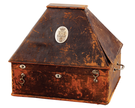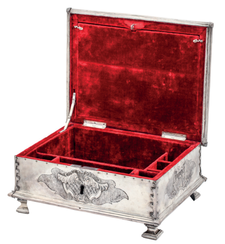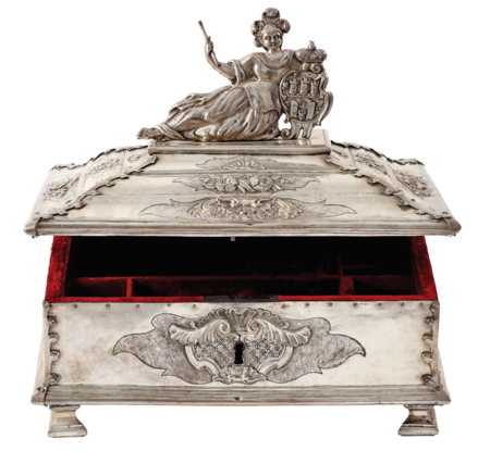 (373–376) Lada krakowskiej rady miejskiej w postaci drewnianej skrzynki obitej srebrną blachą, na czterech srebrnych nóżkach. Wieko wypukłe, u szczytu alegoryczna postać kobieca obejmująca tarczę z herbem Krakowa. Wymiary: wysokość 34 cm, szerokość 40,5 cm, głębokość 32,5 cm. Ufundowana przez magistrat krakowski w 1751 r. lada ta służyła do przechowywania cennych przedmiotów rady, jak insygnia burmistrzowskie, pieczęcie miasta, zapewne też ważne w danym czasie dokumenty, ale służyła również pisarzowi miejskiemu, przechowującemu tam materiały pisarskie. Na powiększeniu (następna strona) wspomniany już herb Krakowa (MH, nr inw. MHK 717/II/1)