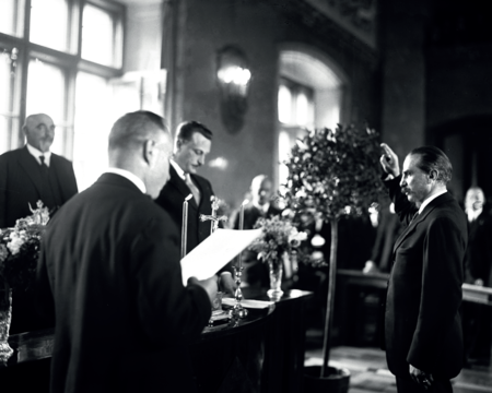 (381) Zaprzysiężenie 18 lipca 1931 r. wybranego dwa dni wcześniej nowego prezydenta – płk. Władysława Beliny-Prażmowskiego. „Ilustrowany Kurier Codzienny” w nr. 198 donosił: na trybunie złożono kowaną w srebrze kasetę […] oraz krucyfiks inkrustowany kością słoniową. Bezpośrednio przed przysięgą przewodniczący dr Duch [Kazimierz, wiceprezydent] włożył na palec przyszłego prezydenta złoty pierścień z herbem m. Krakowa oraz wręczył mu berło władcy miasta. Na fotografii widoczny odbierający przysięgę wicewojewoda dr Mieczysław Bilek (przed nim krucyfiks). Za wicewojewodą inż. Witold Ostrowski, wiceprezydent miasta, na pierwszym planie bokiem podający rotę przysięgi radca Starosolski (NAC, nr inw. 1-A-3222)