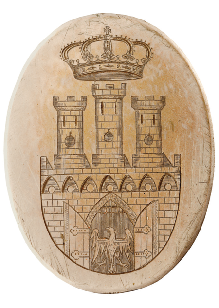 (377–378) Futerał na ladę rady miejskiej (drewno, skóra, mosiądz, ircha) oraz powiększenie plakiety z czołowej ścianki jego wieka z wygrawerowanym w mosiądzu herbem miasta. Datowany na pierwszą tercję XX w. (MK, nr inw. MHK 717/II/5)