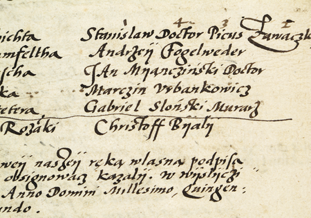 Z księgi radzieckiej obejmującej lata 1567–1575 fragment strony 499 z wykazem rajców urzędujących nominowanych na rok 1573, wśród których znajduje się Krzysztof Biały – oraz powiększenie zapisu imienia (Archiwum Państwowe w Krakowie, sygn. rkps 446, s. 499)