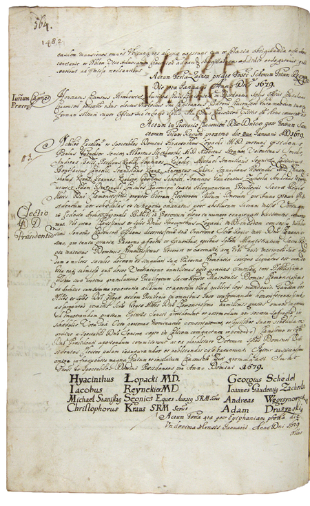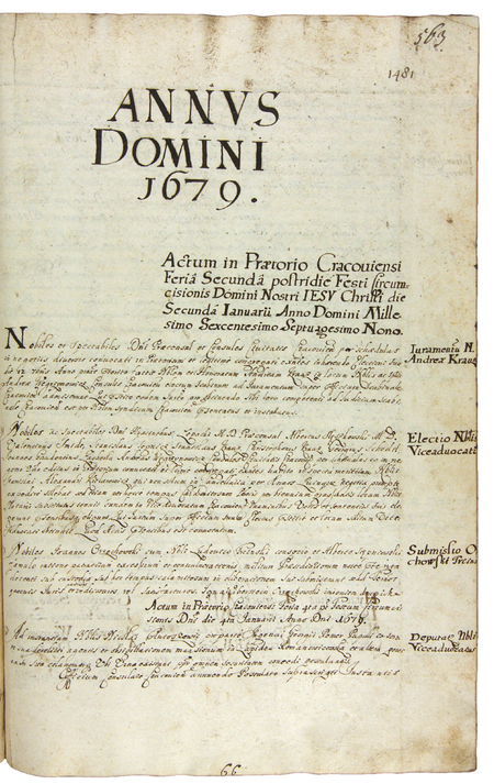 Z księgi radzieckiej obejmującej lata 1676–1680 strony 563–564 z wykazem rajców urzędujących nominowanych na rok 1679, wśród których znajduje się Krzysztof Krauz – oraz powiększenie zapisu imienia i godności sekretarza królewskiego (Archiwum Państwowe w Krakowie, sygn. rkps 468, s. 563–564)