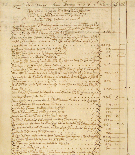 Z księgi miejskiej rachunkowej obejmującej rok 1668 (z wpisami z 1669 roku) fragment strony 58, gdzie „Specyfikacja za co miasto JMP. Chrzysztophowi Krauzowi R.K. ab Anno 1654 usuque ad Anno1659 zostało winno”, tj. zobowiązania finansowe miasta wobec rajcy i burmistrza Krzysztofa Krauza – oraz powiększenie tytułu z jego imieniem (Archiwum Państwowe w Krakowie, sygn. rkps 2066, s. 58)