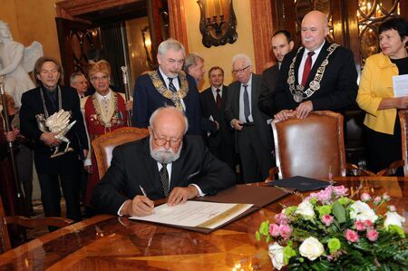 Reprodukcja duplikatu dyplomu honorowego obywatelstwa oraz w foyer Sali Obrad UMK złożenie podpisu przez Krzysztofa Pendereckiego na tym duplikacie w obecności prezydenta miasta.