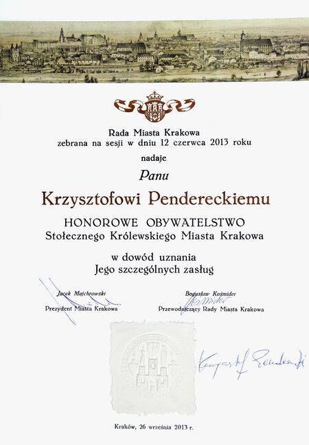 Z uroczystego wręczenia dyplomu honorowego obywatelstwa 26 września 2013 r. w Pałacu Wielopolskich. Krzysztof Penderecki w Sali Obrad RMK podczas wystąpienia oraz własnoręczny podpis uhonorowanego.