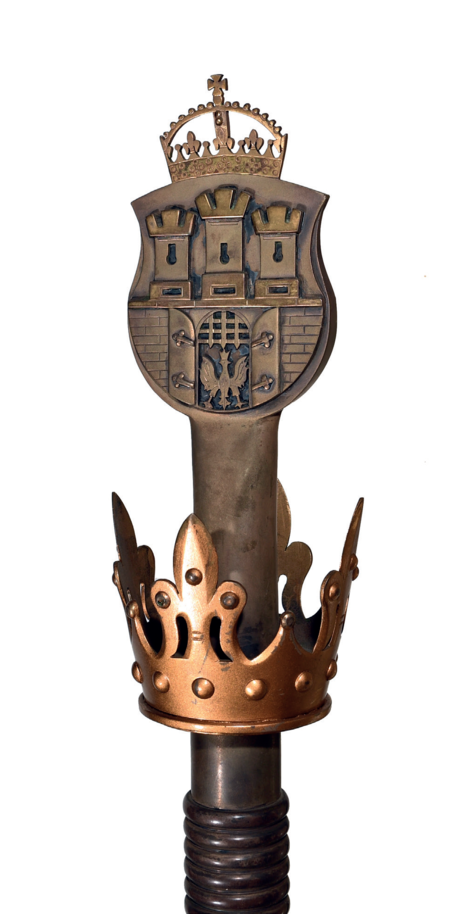 (389–390) Laska prezydialna przewodniczącego Rady Miejskiej wykonana w 1928 r. wraz z nowym wyposażeniem sali Obrad w Pałacu Wielopolskich. Dzieło z pracowni Stefana Iglickiego, mistrza tapicerskiego, radnego w latach 1908–1914, twórcy podium prezydialnego w sali Obrad. Laska drewniana, z mosiężną głowicą, o całkowitej długości 180 cm. Głowica w kształcie herbu Krakowa, poniżej gotycka korona z liliami. Służy głównie do otwierania i zamykania uroczystych sesji (z zasobów UMK)