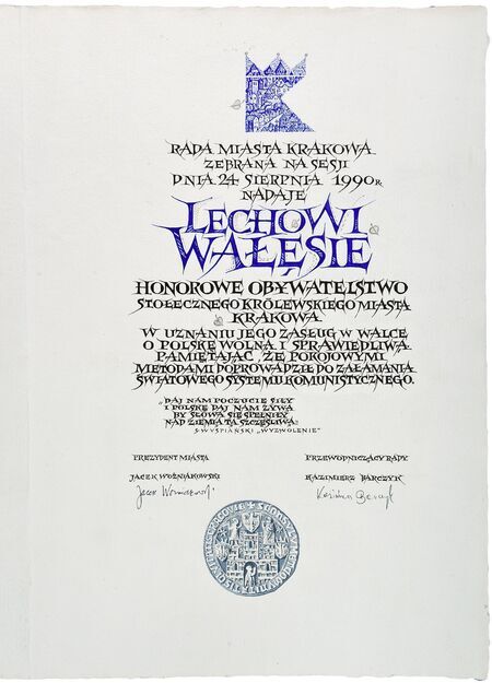 Z uroczystości wręczenia dyplomu honorowego obywatelstwa 17 października 1990 r. w Pałacu Wielopolskich. Lech Wałęsa w sali Obrad RMK oraz własnoręczny podpis uhonorowanego.