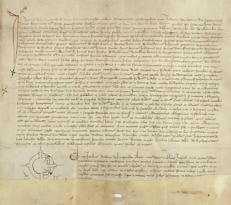 Dokument wydany w formie aktu notarialnego w 1389 roku w Mogile, mocą którego tamtejszy klasztor Cystersów ustanowił przeora Stanisława, podprzeora Jana, klucznika Pawła i prokuratora Mikołaja pełnomocnikami w sprawie kupna wsi Moniakowice i Łęg oraz sprzedaży miastu Krakowowi wsi Dąbie; na dokumencie widoczny znak notarialny – oraz powiększenie zapisu nazwy wsi „Łęg” (Archiwum Narodowe w Krakowie, sygn. perg. 90)