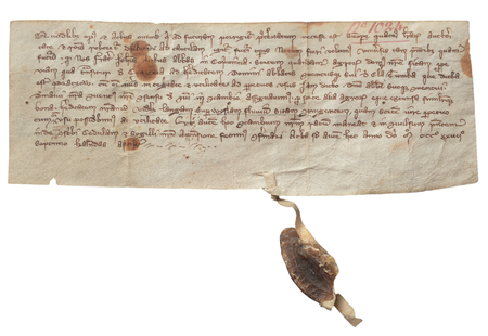 Dokument wydany w 1399 roku w Korczynie, w którym król Władysław [ Jagiełło] stwierdził, że klasztor w Koprzywnicy sprzedał wieś Łęg Mikołajowi, opatowi klasztoru w Mogile, za 475 grzywien groszy praskich; przy dokumencie wyciśnięta w wosku pieczęć majestatowa Władysława Jagiełły (opis na stronie sąsiedniej) – oraz powiększenie zapisu nazwy wsi „Łęg” (Archiwum Opactwa Cystersów w Mogile, sygn. dypl. perg. 142)