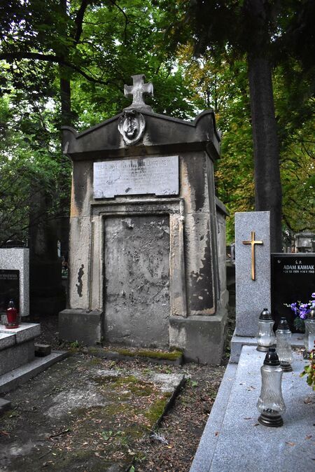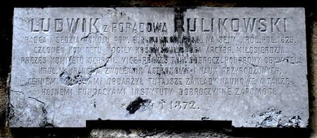 Reprodukcja fotografii portretowej, którą ponad 100 lat temu prawnuczka Ludwika Rulikowskiego, Maria Twarogowa, przyniosła do Archiwum Akt Dawnych Miasta Krakowa, aby dołączyć ją do akt związanych z jego honorowym obywatelstwem, co też uczyniono; niżej miejsce spoczynku – grobowiec rodzinny na cmentarzu Rakowickim w Krakowie w kwaterze VIII oraz zbliżenie tablicy nagrobnej.