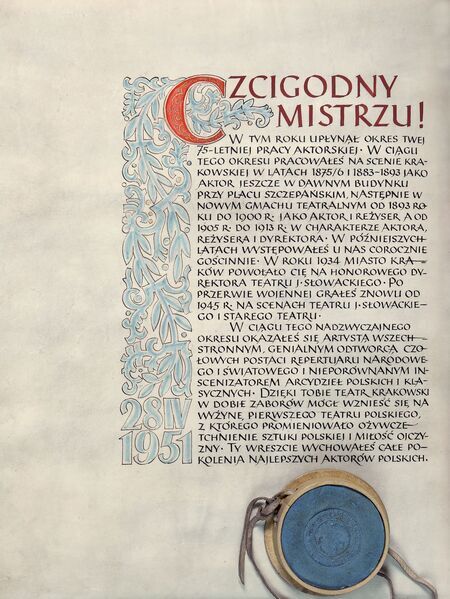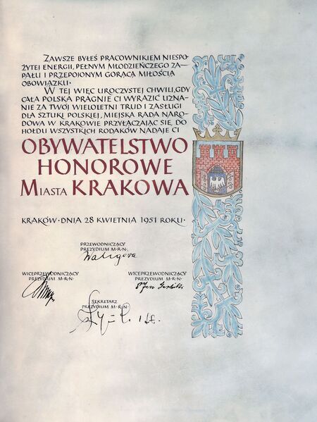 Tytuł nadany uchwałą Miejskiej Rady Narodowej w Krakowie nr sesji V/51 podjętą 28 kwietnia 1951 r. (ANK, sygn. MNR 2, nlb), gdy równorzędny prezydenturze urząd przewodniczącego Prezydium Rady pełnił Marcin Waligóra. Wyróżnienie nastąpiło w ramach obchodów jubileuszu 75-lecia pracy scenicznej uhonorowanego. Wręczenie dyplomu miało miejsce 28 kwietnia 1951 r. w Teatrze im. Juliusza Słowackiego podczas uroczystej gali państwowej związanej ze wspomnianym jubileuszem. Kopia dyplomu została zdeponowana w Muzeum Krakowa.