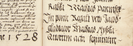 Z radzieckiej Kazimierza obejmującej lata 1521–1533: fragment wpisu dokumentującego wybór rady urzędującej na rok 1528, z Maciejem piekarzem w składzie – oraz zbliżenie zapisu imienia (Archiwum Narodowe w Krakowie, sygn. K 9, s. 173)