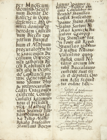 Z księgi radzieckiej Kazimierza obejmującej lata 1545–1551: wpis dokumentujący wybór rady urzędującej na rok 1546, z Maciejem Rykałą w składzie – oraz zbliżenie zapisu imienia (Archiwum Narodowe w Krakowie, sygn. K 11, s. 32–33)