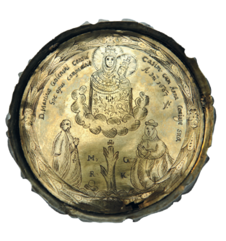 Kielich mszalny srebrny złocony z ozdobnym guzem z kryształu górskiego ufundowany w 1667 roku przez Marcina i Annę Golińskich dla kościoła Bożego Ciała; na stopie kielicha ryt przedstawiający wyobrażenie Najświętszej Marii Panny z Chrystusem i modlących się ofiarodawców oraz litery: M[arcin] G[oliński] R[ajca] K[kazimierski] (Skarbiec klasztoru Kanoników Regularnych Laterańskich przy kościele Bożego Ciała w Krakowie)Karta tytułowa Kroniki Golińskiego – tomu poświęconego historii Kazimierza, spisanego w roku 1658 (Biblioteka Zakładu Narodowego im. Ossolińskich, sygn. rkps 188)