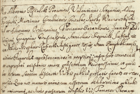 Z księgi radzieckiej Kleparza obejmującej lata 1673–1690: fragment wpisu z 1682 roku stanowiącego protokół ze wspólnego posiedzenia władz kleparskich, z Marcinem Grudniewiczem w gronie rajców – oraz zbliżenie zapisu imienia i urzędu (Archiwum Narodowe w Krakowie, sygn. KL 39, s. 243)