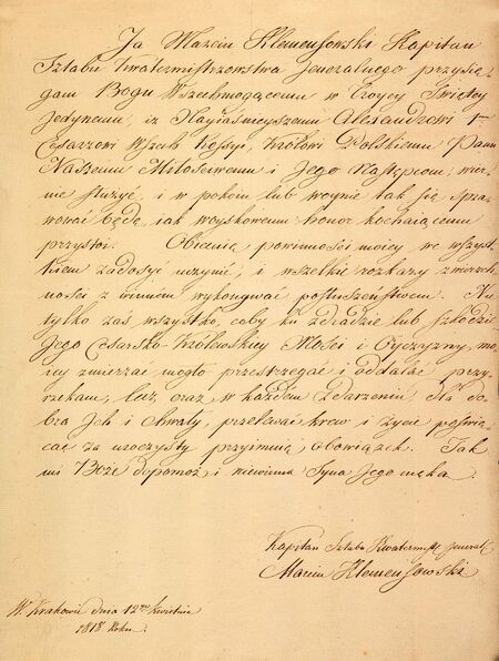 Reprodukcja złożonej w 1818 r. (gdy Klemensowski zakończył działania w WMK i obejmował obowiązki przy demarkacji między Królestwem Polskim a Austrią) na piśmie przysięgi na wierność cesarzowi Imperium Rosyjskiego i rzetelność w pracy;