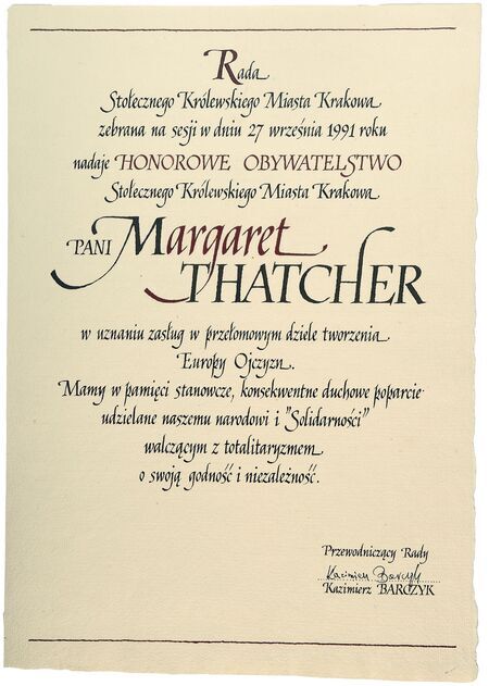 Z uroczystości wręczenia dyplomu honorowego obywatelstwa 3 października 1991 r. w Pałacu Wielopolskich. Margaret Thatcher w sali Obrad RMK oraz własnoręczny podpis uhonorowanej.