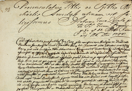Z księgi radzieckiej obejmującej lata 1747–1757 fragment strony 94 zawierająca nagłówek wpisów spraw za kadencji burmistrzowskiej Michała Awendyka w 1748 roku – oraz powiększenie zapisu imienia i funkcji burmistrza (Archiwum Państwowe w Krakowie, sygn. rkps 480, s. 94)