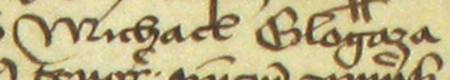 Dokument wystawiony w 1438 roku w Kazimierzu przez ławników miejskich, z Michałem Glogoszą w składzie, w którym ława stwierdziła, że Mikołaj Gedanke odstąpił swój dom położony w rynku Jakuszowi Schdzychniczowi i jego żonie Katarzynie; przy dokumencie na pergaminowym pasku pieczęć ławnicza kazimierska, zachowana w ułamkach Dokument wystawiony w 1438 roku w Kazimierzu przez ławników miejskich, z Michałem Glogoszą w składzie, w którym ława stwierdziła, że Mikołaj Gedanke odstąpił swój dom położony w rynku Jakuszowi Schdzychniczowi i jego żonie Katarzynie; przy dokumencie na pergaminowym pasku pieczęć ławnicza kazimierska, zachowana w ułamkach - oraz zbliżenie pieczęci i zapisu imienia (Archiwum Narodowe w Krakowie, sygn. perg. 202)