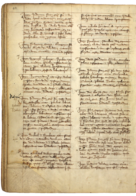 Z „Najstarszej księgi” strona 42 z wpisem z 1317 roku, potwierdzającym, że Michał Grabe oddał swojej żonie Elżce połowę dworzyszcza naprzeciw bramy Wiślnej i 30 grzywien groszy – oraz powiększenie zapisu imienia (Archiwum Państwowe w Krakowie, sygn. rkps 1, s. 42)