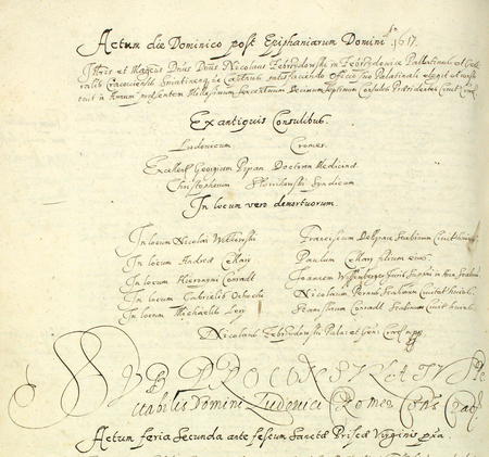 Z księgi radzieckiej obejmującej lata 1612–1621 fragment strony 632 z wykazem rajców urzędujących wybranych na rok 1617, wśród których wymieniono dotychczasowego ławnika Stanisława Konradta (nr 470), wybranego na miejsce po zmarłym rajcy Michale Lerim – oraz powiększenie zapisu imienia (Archiwum Państwowe w Krakowie, sygn. rkps 458, s. 632)