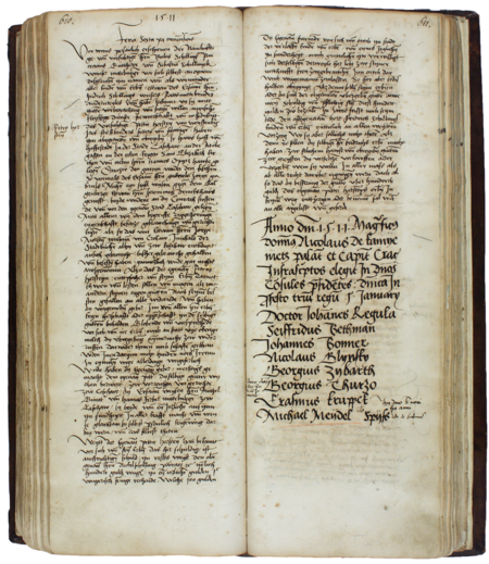 Z księgi radzieckiej obejmującej wpisy z lat 1500–1512 strony 610–611, gdzie znajduje się lista wybranych na rok 1511 rajców urzędujących z nowo wybranym Michałem Meydlem na ostatnim miejscu – oraz powiększenie zapisu imienia i przydomku (Archiwum Państwowe w Krakowie, sygn. rkps 431, s. 610–611)