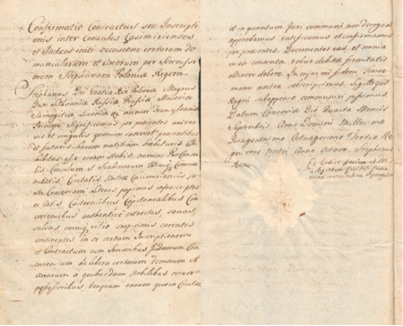 Fragmenty początkowy i końcowy kopii dokumentu wydanego w 1583 roku, mocą którego Stefan Batory zatwierdził układ zawarty w tymże roku między Kazimierzem a kazimierską gminą żydowską w sprawie poszerzenia granic miasta żydowskiego w Kazimierzu; wśród przedstawicieli miasta odnotowany został rajca Michał Sterczuwan – oraz zbliżenie zapisu imienia (Biblioteka Jagiellońska, sygn. rkps 136, s. 335, 350)