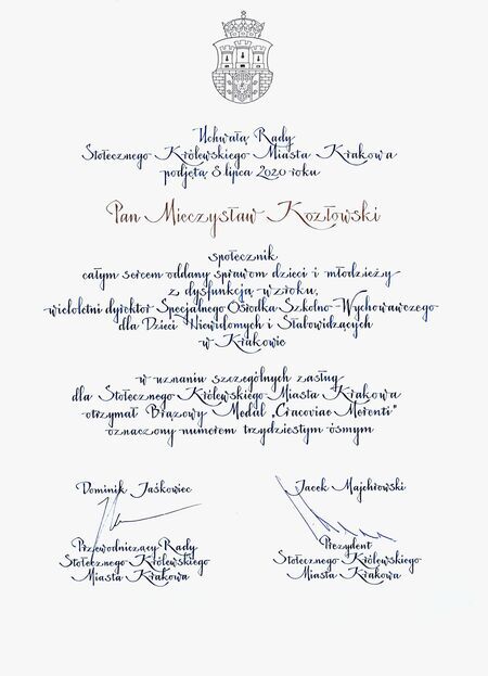 …w uznaniu szczególnych zasług dla Stołecznego Królewskiego Miasta Krakowa… (z uchwały Rady Miasta Krakowa nr XLII/1121/20) |