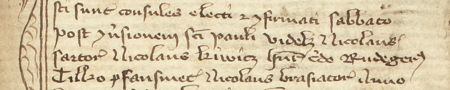 Z najstarszej zachowanej księgi radzieckiej Kazimierza obejmującej lata 1369–1381: fragment wpisu dokumentującego wybór rajców na rok 1376, z Mikołajem Kiwiczem w składzie – oraz zbliżenie zapisu imienia (Archiwum Narodowe w Krakowie, sygn. K 1, s. 143)