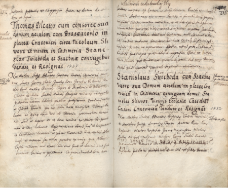 Z Liber inscriptionum… klasztoru oo. Augustianów w Kazimierzu: strony z początkowym fragmentem dokonanego w roku 1681 wpisu przywołującego wydane w 1432 roku przez wójta i ławników kazimierskich, z Mikołajem Panagą w składzie, potwierdzenie sprzedaży przez Stanisława Swiebodę starszego (nr 124) i jego żonę Stachnę domu narożnego przy ul. Krakowskiej w Kazimierzu, przylegającego do domu Stanisława Śliwosza, na rzecz wikariuszy kościoła katedralnego w Krakowie – oraz zbliżenie zapisu imienia i urzędu ławniczego (Biblioteka Naukowa PAU/PAN, sygn. rkps 1676, s. 315)