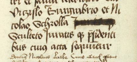 Z księgi ławniczej Kazimierza obejmującej lata 1461–1484: fragment wpisu z 1486 roku dokumentującego sesję sądową ławy miejskiej pod przewodnictwem Stanisława Wycisły (nr 135) w roli burgrabiego i z udziałem wójta Mikołaja Schrolla, na tej sesji sądowej używającego tytułu sołtysa – oraz zbliżenie zapisu imienia (Archiwum Narodowe w Krakowie, sygn. K 377, s. 139)