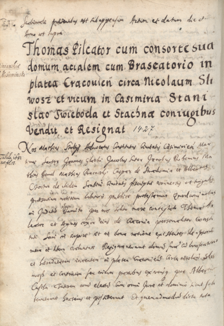 Z Liber inscriptionum… klasztoru oo. Augustianów w Kazimierzu: strona z początkowym fragmentem dokonanego w roku 1681 wpisu, który stanowi kopię aktu z 1427 roku, w którym Tomasz czapnik wraz z żoną sprzedaje Stanisławowi Swiebodzie (nr 124) i jego żonie Stachnie swój narożny dom ze słodownią, położony przy ul. Krakowskiej obok domu Mikołaja Śliwosza – oraz zbliżenie zapisu imienia (Biblioteka Naukowa PAU/PAN, sygn. rkps 1676, s. 314v)
